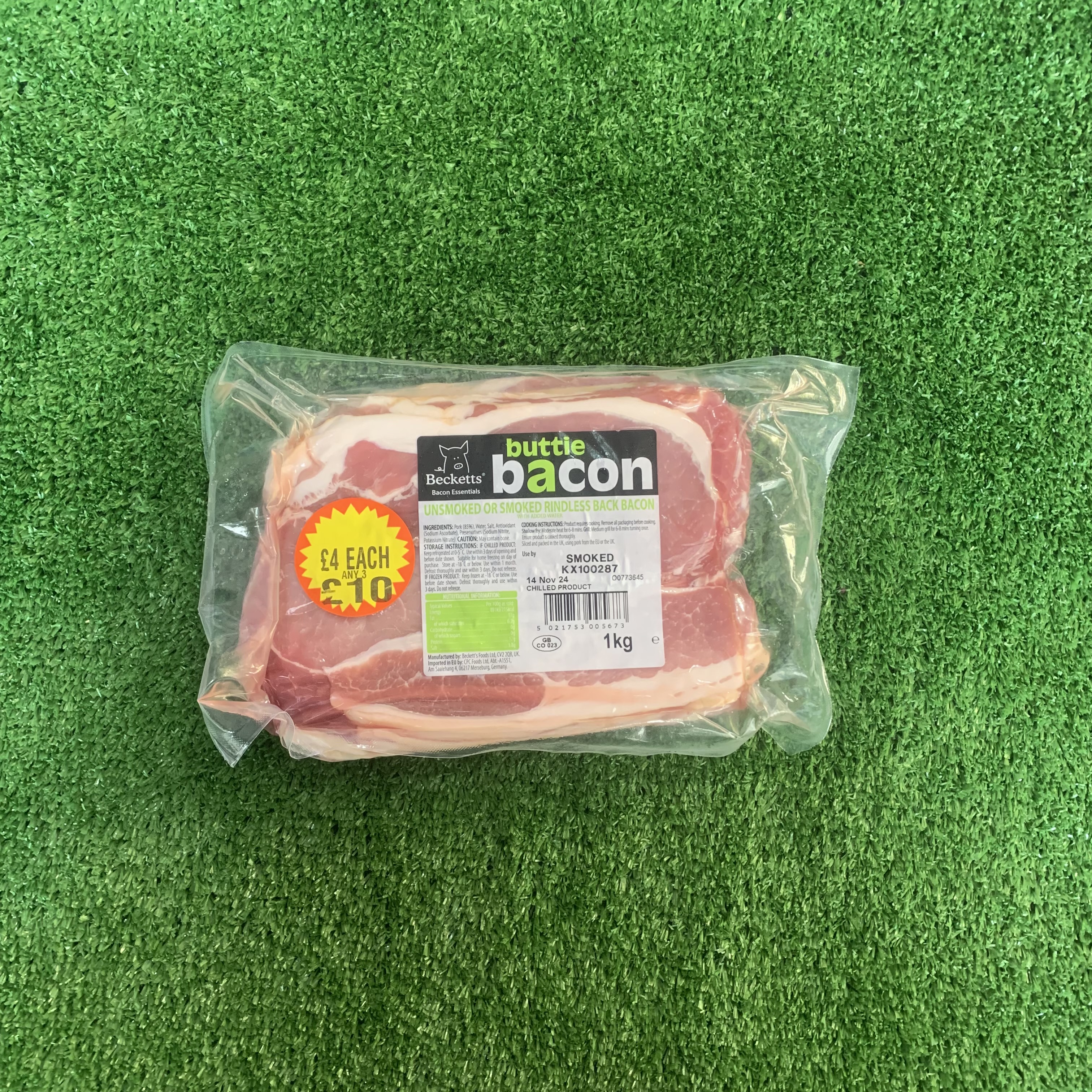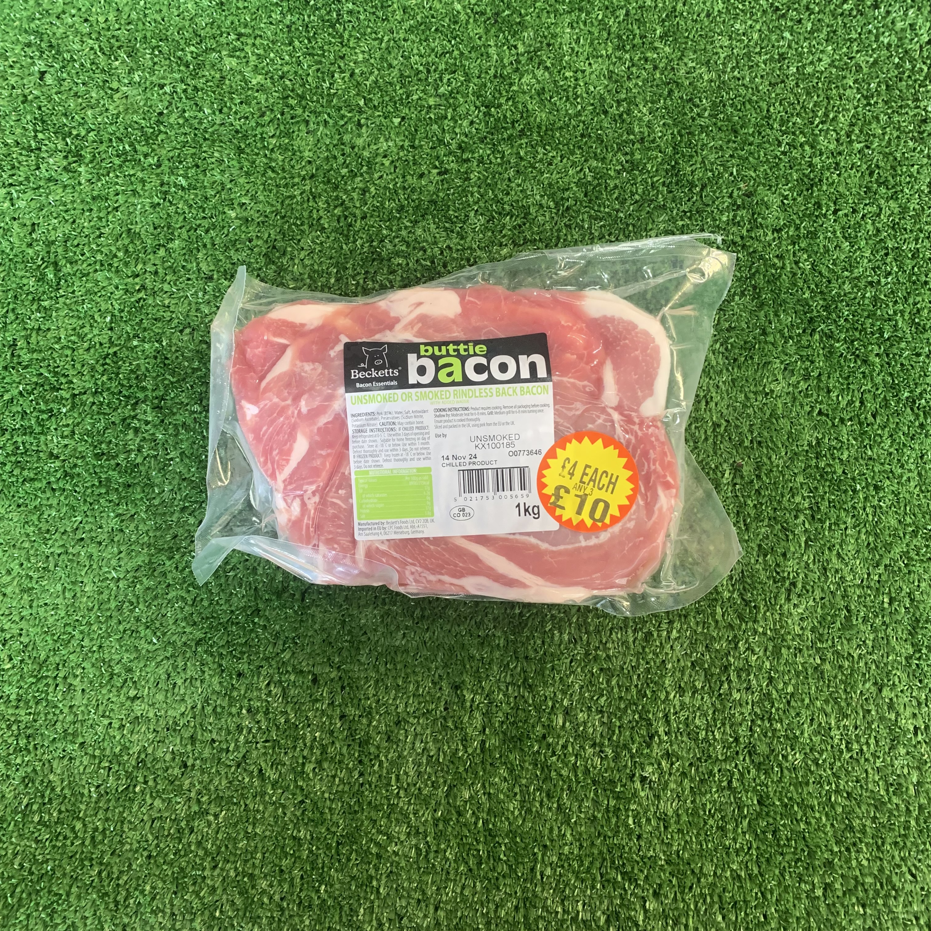 unsmoked rindless back bacon (buttie bacon)